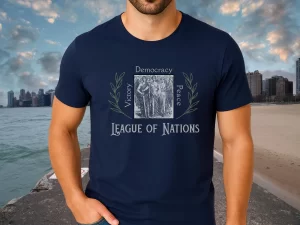 Looking to represent a different period in time? The League of Nations emerged from the Treaty of Versailles, signed in the Hall of Mirrors in 1919. The design of this shirt features “Victory”, “Democracy”, and “Peace”, depicted as ancient goddesses.